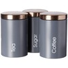 - ◈USEFUL AND STYLISH◈ The new MegaChef Essential Kitchen Storage 3 Piece Sugar, Coffee and Tea Canister Set in Matte Gray is a stunning addition to any kitchen. The modern and minimalist design will add a subtle and useful touch of beauty and style to your counter tops. Each canister features an accented Copper Finish lid to enhance the subtle elegance of the matte finish of the canisters.