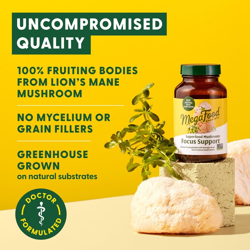 MegaFood Superfood Mushroom Focus Support - Doctor Formulated Lions Mane Supplement Capsules - Lions Mane Mushroom Supplement with Clinically Studied Bacopa - Vegan - 60 Capsules, 30 Servings