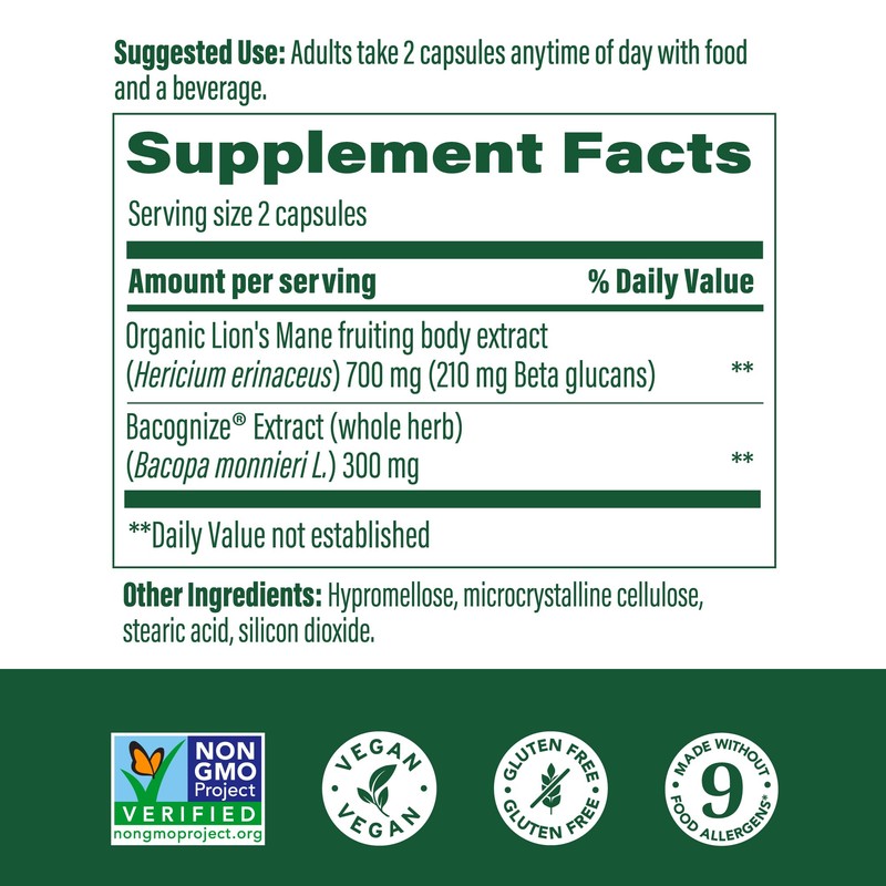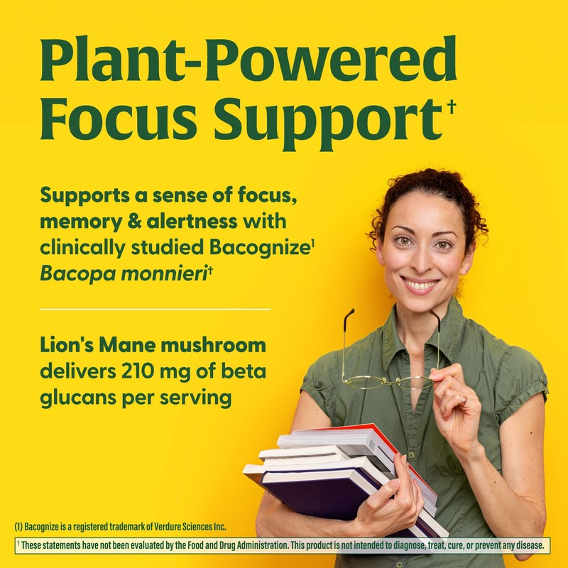 - PLANT-POWERED FOCUS & MEMORY SUPPORT: Crafted with Lion’s Mane mushroom and Bacognize(1) Bacopa monnieri to support a sense of focus, mental function, attention, memory, and alertness+