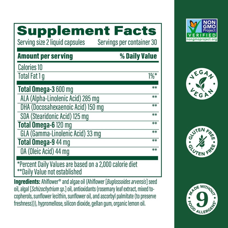 MegaFood Vegan Omega 3 6 9 - Burp-less Omega 3 Supplement - 600 mg Plant-Based Omega-3 & 150 mg DHA Per Serving - Heart, Brain, Vision & Joint Support - Fish Oil Alternative - 60 Capsules, 30 Servings