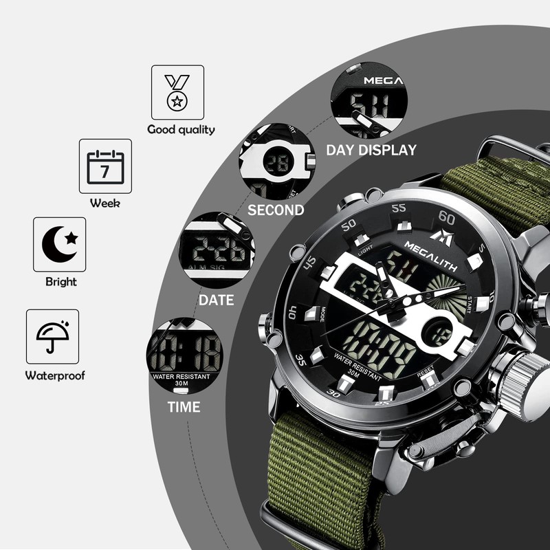MEGALITH Mens Watches Digital Black Military Watch Sports Waterproof Analog Quartz Multifunctional Tactical Heavy Duty Men's Wrist Watches, LED Dual Time Backlight Alarm Stopwatch, Green Nylon Watch
