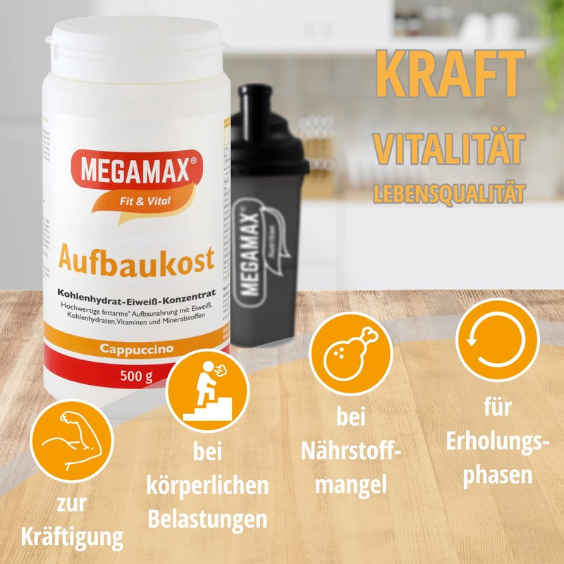 - Ideal as a weight gainer shake for strengthening and underweight, for physical and mental performance, with physical stress, with nutrient deficiency in age, ideal for recovery phases after medical treatments, highly soluble – easy to eat. The easiest way to prepare with the practical Megamax shaker, ideal nutrition, low-carbon nutrition ingredients.