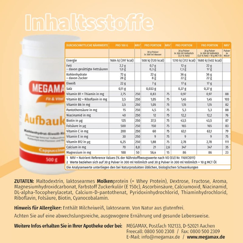 Megamax build-up diet or Weight Gainer is a tasty, low-fat and easy to eat restoration food with many vital nutrients. The food contains protein, carbohydrates, vitamins and minerals. The proteins contained in the product contribute to an increase and maintenance of muscle mass and to the maintenance of normal bones. The minerals calcium and magnesium in combination with the vitamins B6, B12, pantothenic acid and niacin ensure a normal energy metabolism. B vitamins support the nervous system and provide normal mental functions. Biotin, niacin, riboflavin helps maintain healthy mucous membranes. Note for Allergy Sufferers: Contains milk protein, low lactose. Naturally gluten free