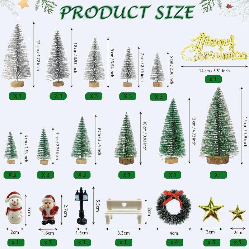 • Bottle Brush Trees: There are 42 in total, including 23 mini Christmas trees and a snowman, a Santa, a chair, a street lamp, a letter sign, 10 stars and 4 small garlands to decorate your Christmas village.