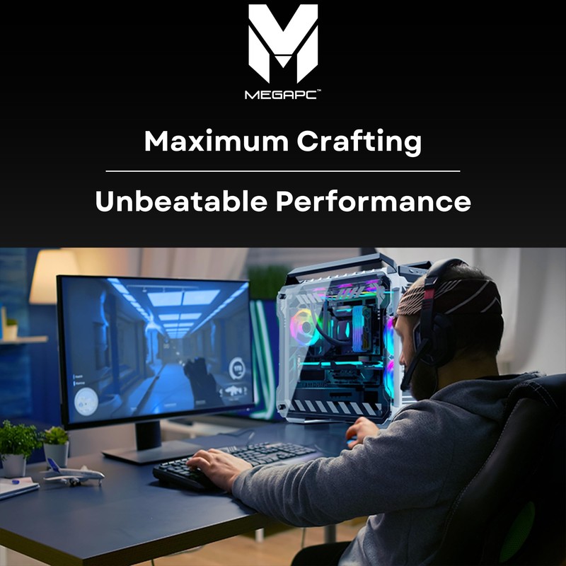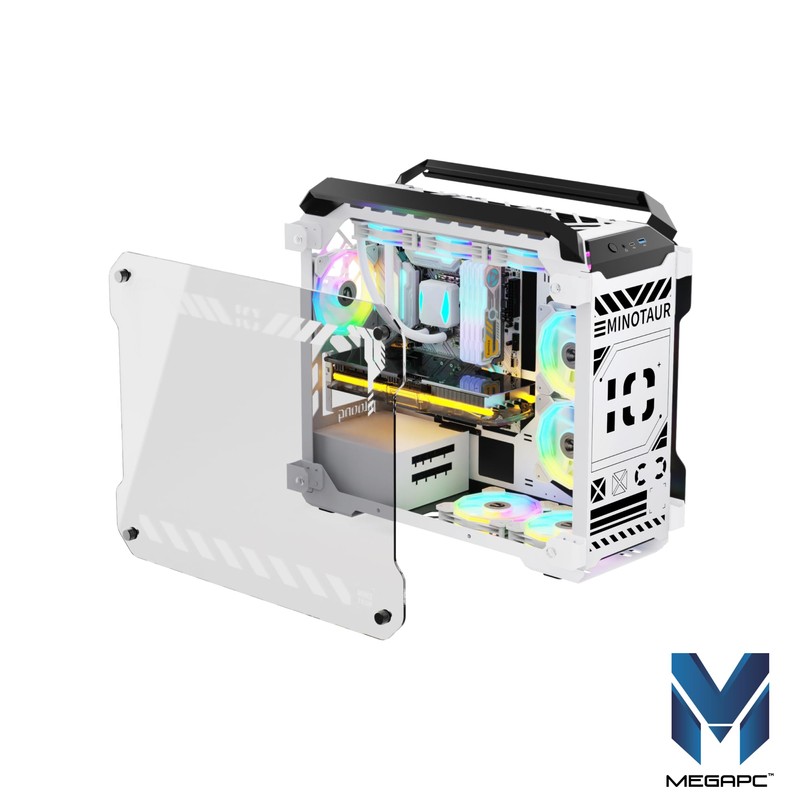 MegaPC Mino Open-Frame ATX Gaming Case โ Industrial Design, Tempered Glass Panels, High Airflow, ARGB Lighting, USB-C Port (Black/White/Print Stream, with Fans Only)