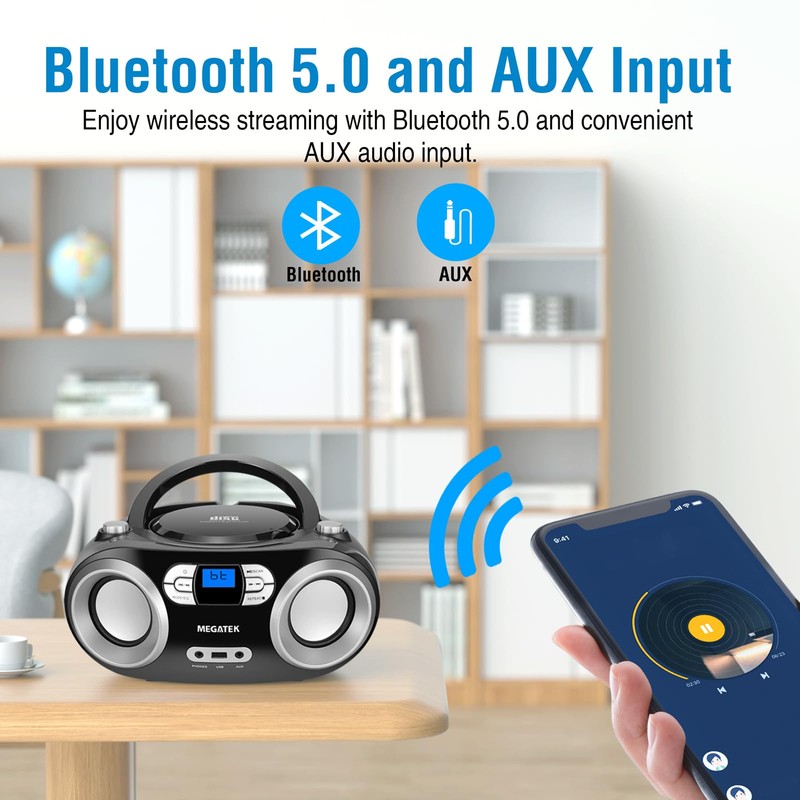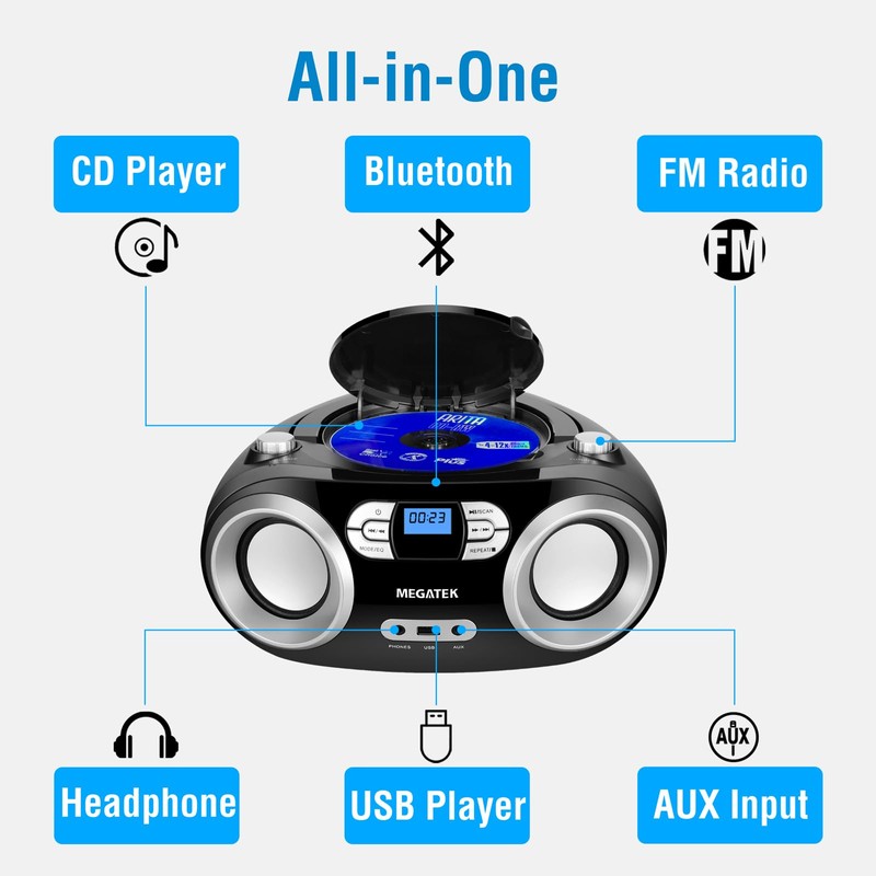 MEGATEK Portable CD Boombox with FM Stereo Radio, Bluetooth, USB Port, and Backlit LCD Display | CD-R/CD-RW/MP3-CD Compatible | AUX Input | Headphone Jack | Programmable CD Player - Black