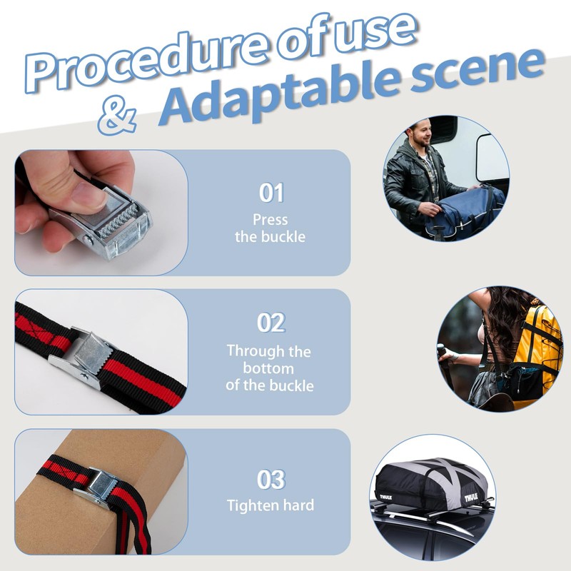 - Wide applications: the straps are of high quality and have excellent tensile and compressive strength.Our lashing strap is not only suitable for tying vans, motorcycles and trucks for transporting bulk goods, but also for camping, sports and securing your luggage, both for your daily outdoor activities and transporting goods.Sturdy and durable.