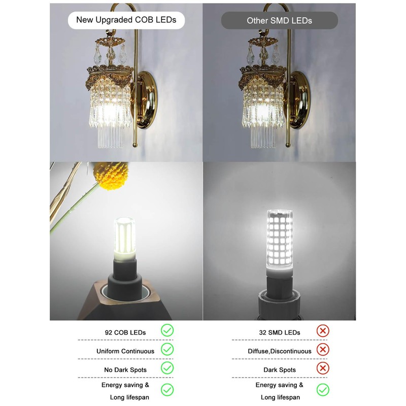 - 💡【NEW Upgrade COB LED Bulbs G9】- Megereet G9 LED light bulb 500lm, 2700K warm white, 360° beam angle with 92pcs energy-efficient upgrade LED COB chips.Unlike traditional SMD light bulbs, our new upgraded COB LED bulbs have virtually no dark spots, and the densely packed light emitting units create a brighter, softer, spot-free, and more uniform light, with a 360-degree beam angle for a wider range of light emission!