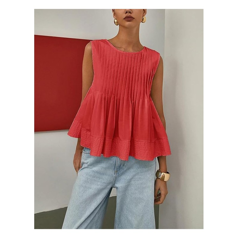 Megfie Womens Summer Pleated Peplum Sleeveless Blouse Tank Tops Round Neck Y2K Babydoll Blouse Shirt(0869-Red-S)