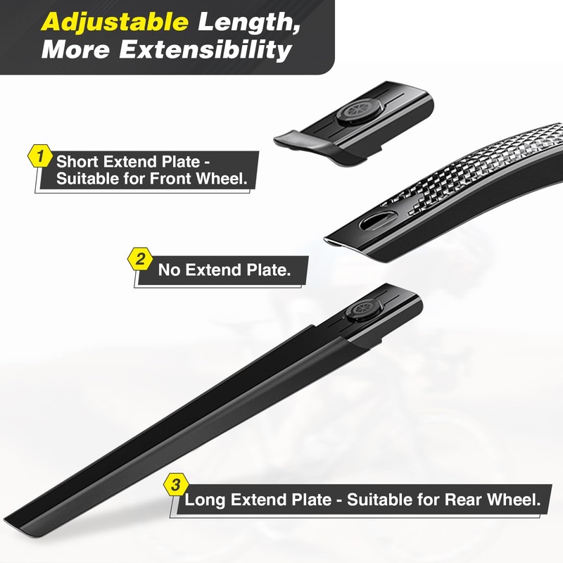 - Two-section Buckle Extender Design: Easy to detached, 2 kinds of extender optional, free combination. The long extender covers wider tire area, effectively blocking the mud splash and providing better protection. The lightweight wind breaking shape reduces wind resistance and optimizes the riding experience, making every ride smoother.