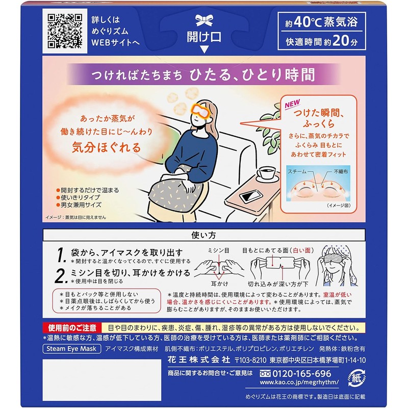 Fluffies with steam and fits snugly to your eyes. Take advantage of your daily moments. Approx. 104°F (40°C) steam bathing; Comfortable time: Approx. 20 minutes