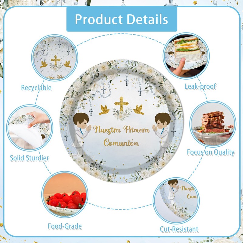 - Exquisite Design: All first communion party decorations have adopted consistent patterns and colors, whitch are predominantly white and gold, with the words " nuestra primera comunión" printed on it; The golden cross in the center of the plate, glittering, symbolizes faith and purity. The baptism plates and napkins dinnerware set creates a peaceful atmosphere for baptisms and religious events