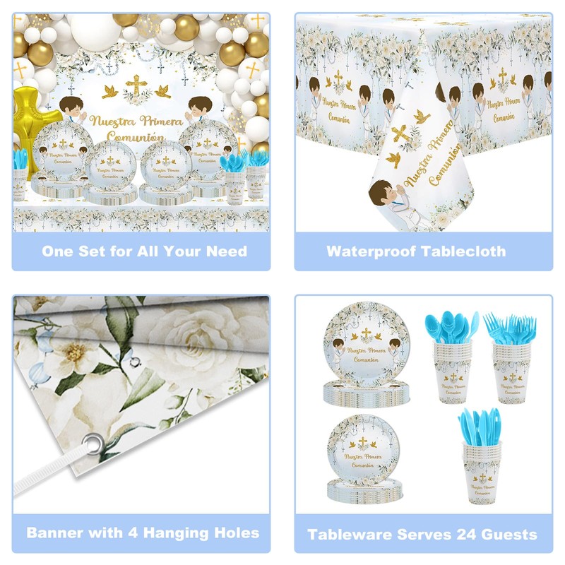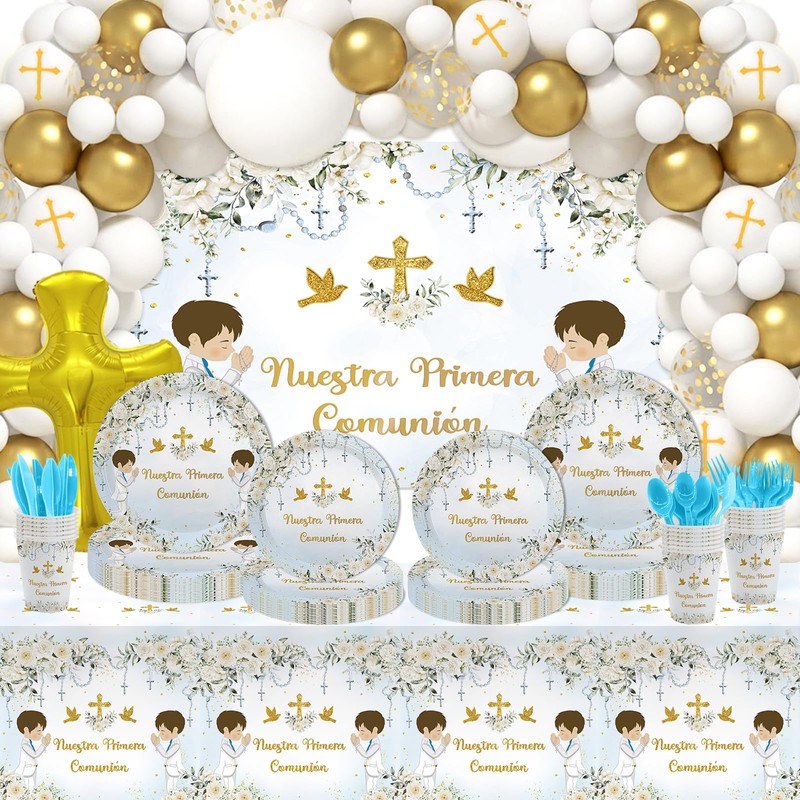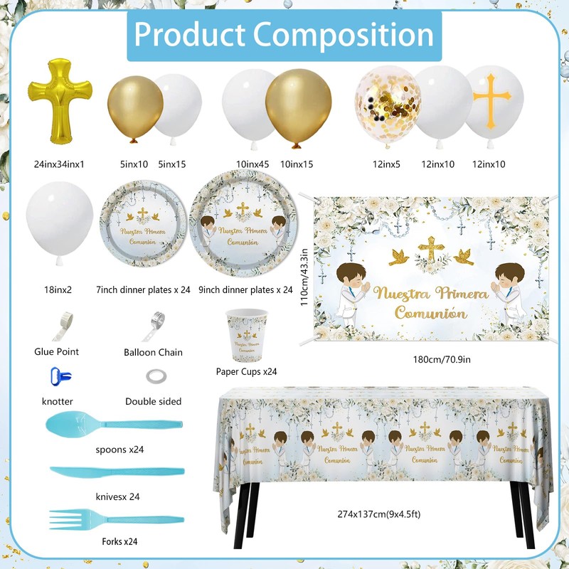 - Nuestra Primera Comunión Party Supplies: Our 263Pcs mi primera comunion decoracion includes everything you need for a christening party, including 24pcs 9inch plates, 24pcs 7inch plates, 24pcs paper cups, 24pcs cutlery, ,1pcs nuestra primera comunión photography background, 1pcs tablecolth ,113 x balloons , 1 x balloon tape strip, 1 x adhesive dispens
