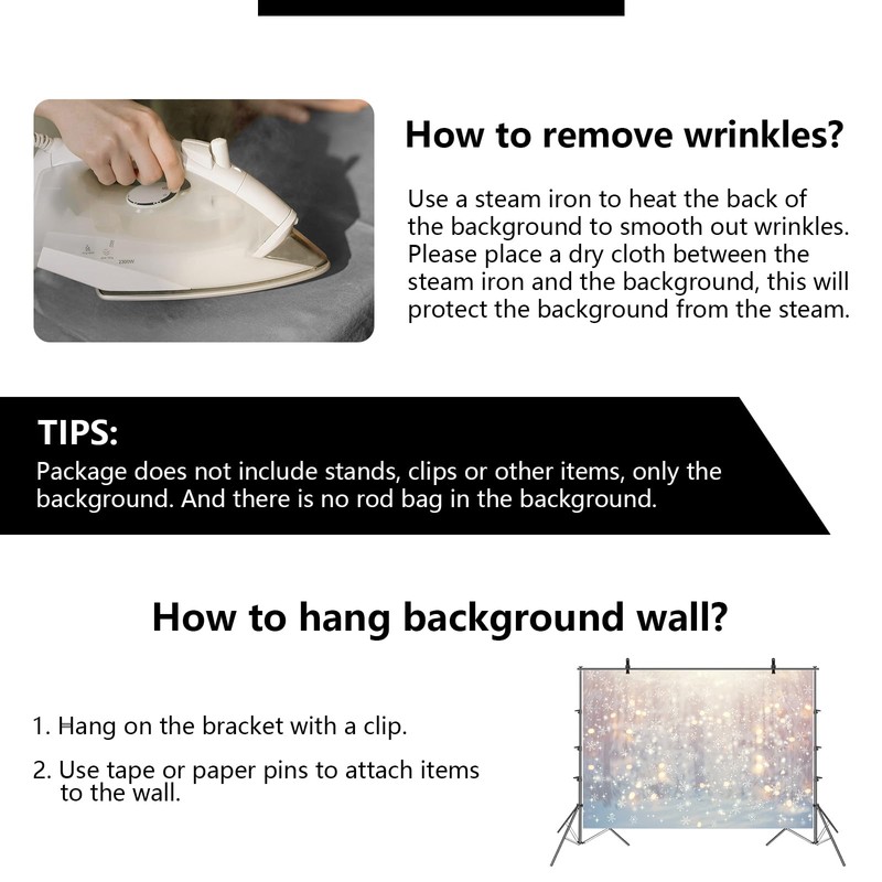 - Convinent to use: Hanging the backdrop to the stand with clips or using nails or tape to fix it on the wall. If necessary, please iron the back side (not the image side) with low temperture to remove the wrinkle