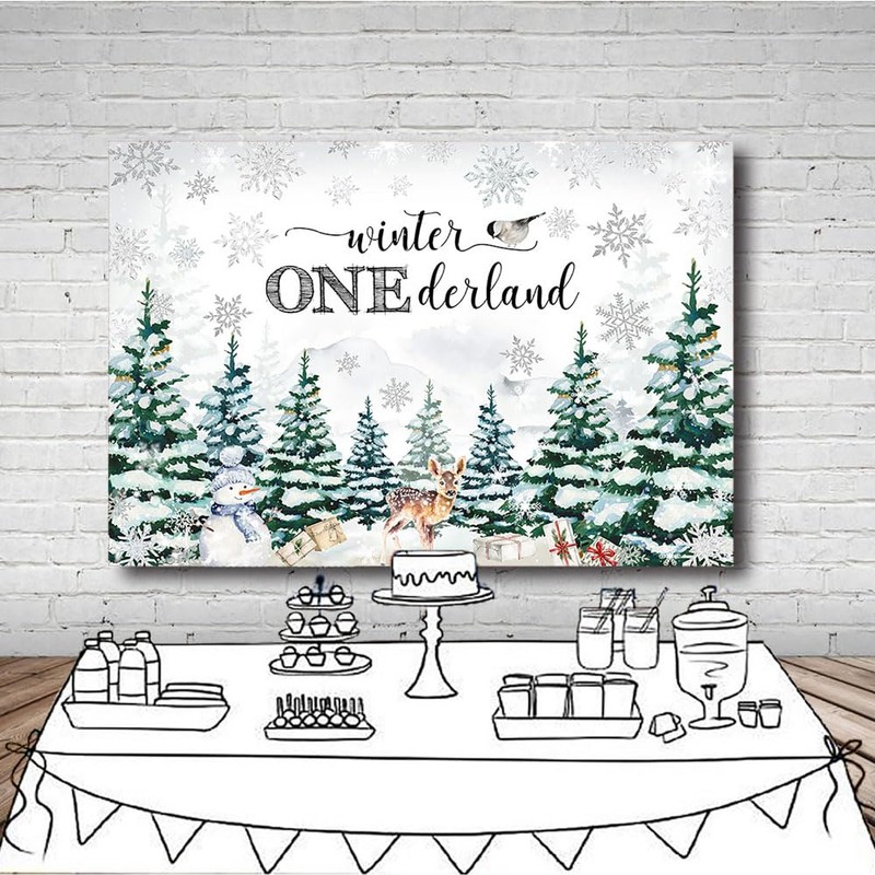 MEHOFOND 7x5ft Winter Onederland Backdrop Kids 1st Birthday Photography Background Winter Wonderland Silver Snowflake Pine Tree Deer 1st Birthday Party Decorations Banner Photo Booth Props
