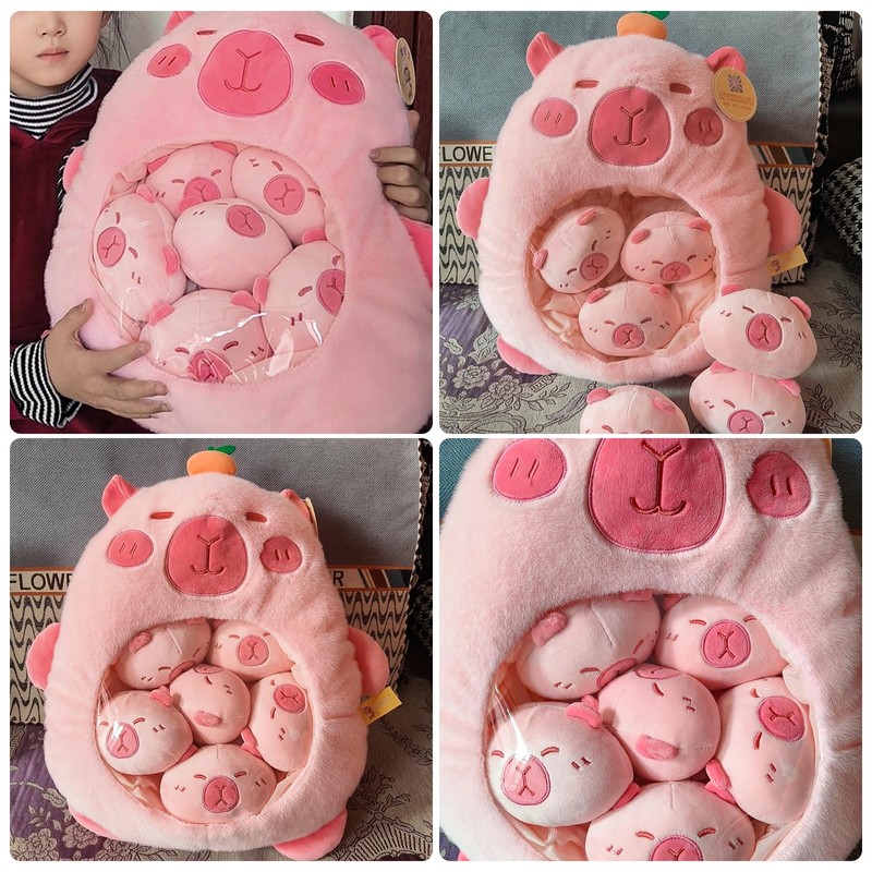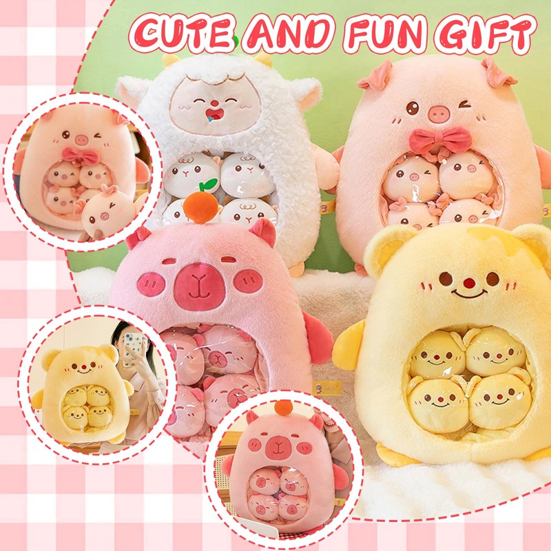 - Filled with 6 Small Dolls Inside: Each cute pillow contains 6 stuffed animal plush dolls. There is a zip on the back, so you can open it and take it out at any time. Not only do you get a cute pillow, but you also get multiple cute animal doll pals. Plus it's easier to clean. The large doll can be used as a creative snack bag for your favourite snacks