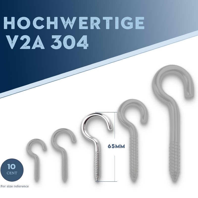 - Premium materials: perfect V2A standard 304 stainless steel A2 hook screw, with smooth surface of the hook, which protects your items well and sharp edge of the thread, which can easily drive into wood materials such as walls, decks; Screw in hook is solid and durable, with excellent corrosion resistance and rust resistance; Screw in hook provides a long service life; This Q hook suit for long time outdoor and indoor work.
