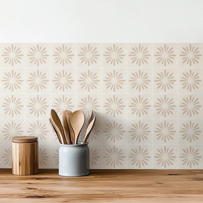 meihea 30 Pack, 4x4 Inch Neutral Peel and Stick Tiles, Modern Geometric Sunburst Decals for Backsplash, Stairs, Furniture & Countertops