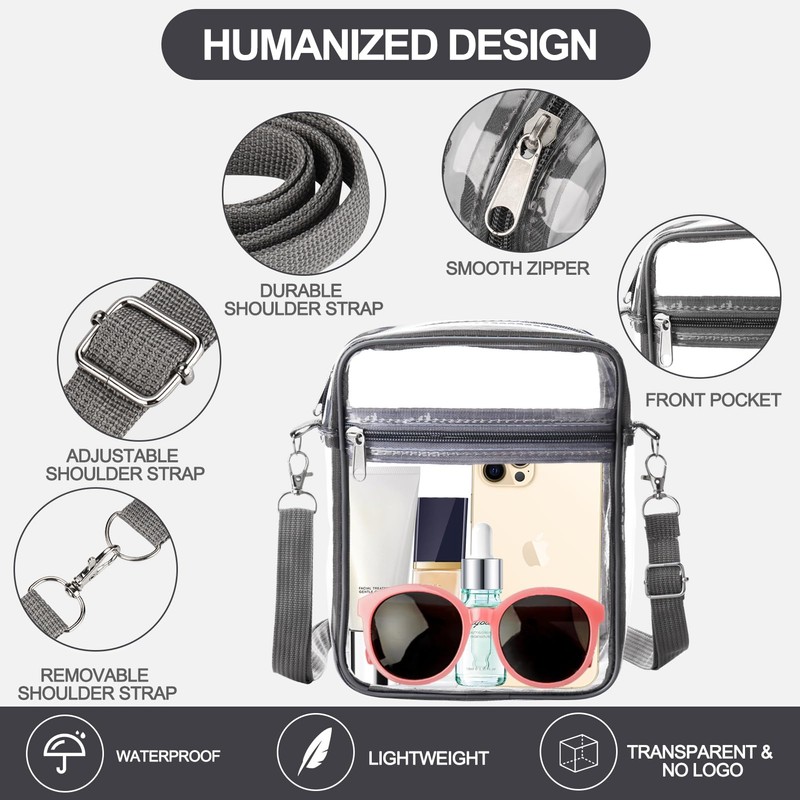 Adjustable & Removable Shoulder Strap; Transparent All Around & No Logo; Smooth Zipper & Neat Stitching.