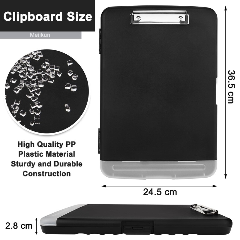 - Large Storage Space: Clipboard measures 36.5 x 24.5 x 2.8 cm and weighs 440 grams. The side of the clipboards open up into a paper storage space that can safely hold 200 sheets of A4 or Letter size paper. Dedicated pen storage with a translucent bottom pen holder that can hold up to 6 slim pencils