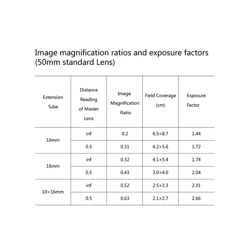 - Macro extension tube can be used alone or in superimposed,When using the extension tubes alone (10 mm or 16 mm) or combination (10mm+16mm=26mm), the focal length of lens should be greater than the length (10mm 16mm or 26mm ) of the tube