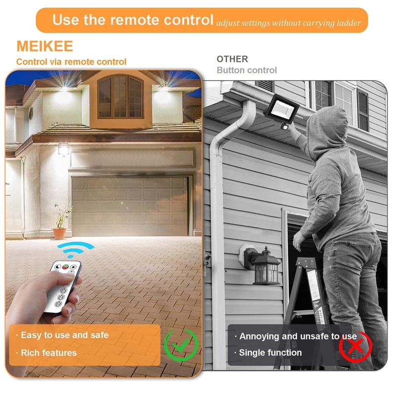 - [Stepless Brightness]: MEIKEE latest sensor light achieves stepless brightness from 10% to 100%, with larger nano reflective surface to reduce unnecessary light reflection, front frame adopts advanced nano materials instead of glass, the whole flood light is lighter, thinner and space saving. Impact resistance, anti-fall and scratch resistance. With a widened and thickened 180° adjustable metal bracket, the led floodlight can be reinforced onto the ceiling and walls
