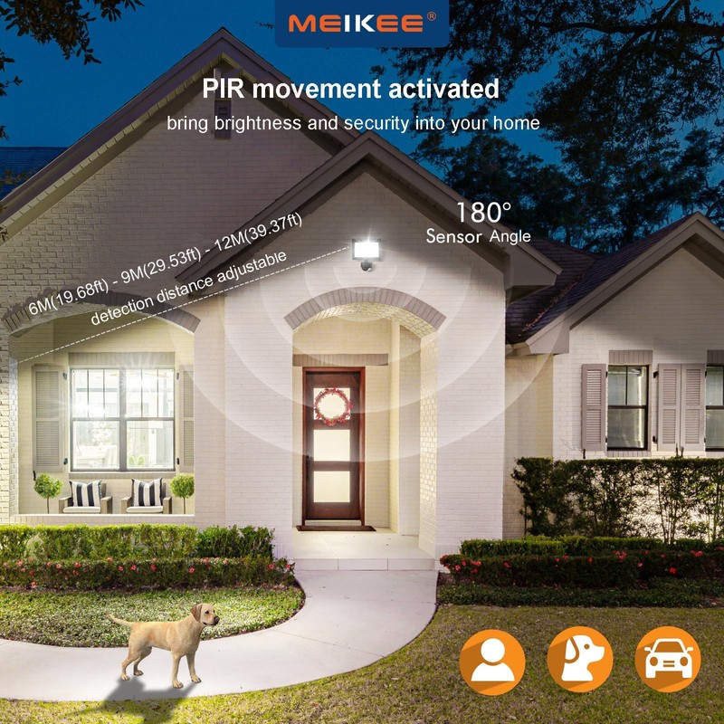 - [Adjustable Sensing Distance]: Detection distance of the motion light is up to 12m(39.37ft), and it can be adjusted to 50%-80%-100%, that is about 6m(19.68ft)-9m(29.53ft)-12m(39.37ft). With 120° beam angle to light up maximum area, 180° Sensor angle to catch any movements around. MEIKEE 35W security lights provide security illumination for your home or other business accommodations