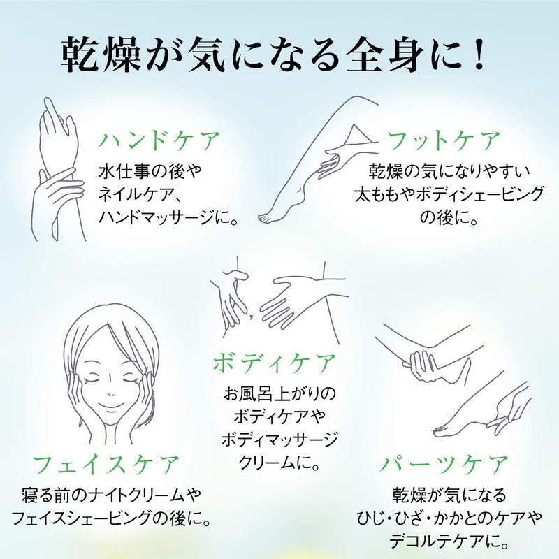 - (4 moisturizing ingredients) Sugar Sularan, Sophilan Extract, Shea Butter Jojoba Oil; 4 moisturizing ingredients blend into the skin for a firm moisturizer. Not only for hand care and foot care, it can also be used for areas where you are concerned about dryness, such as the décolleté, elbows, heels, and waist
