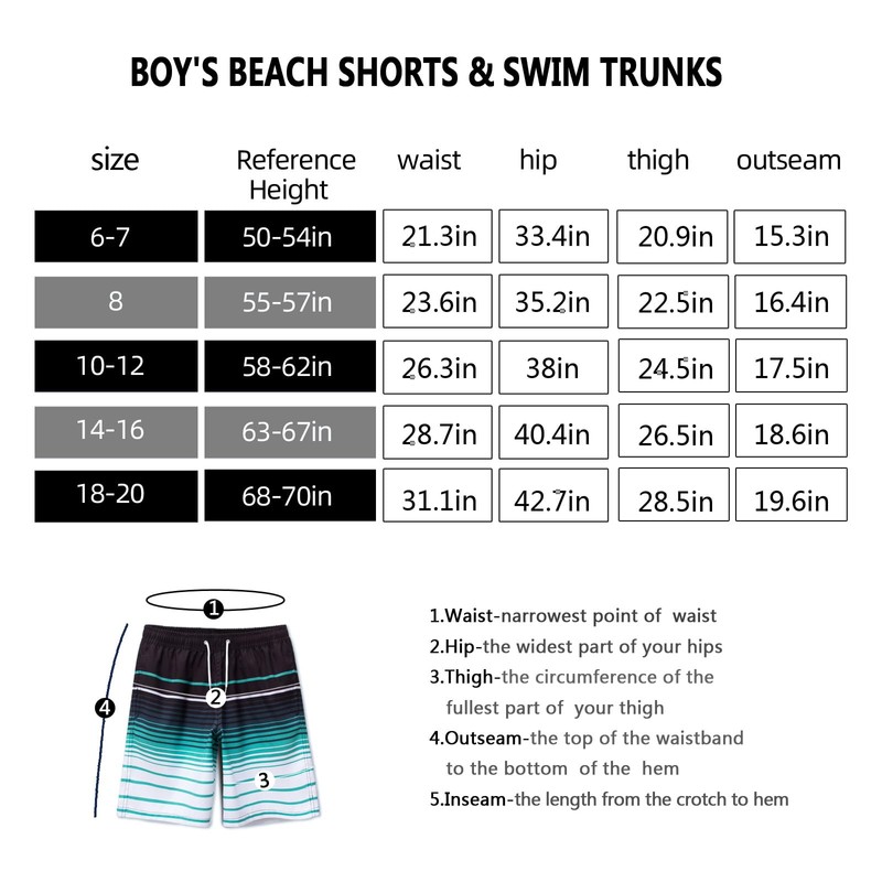 - Swimming Trunks with Compression Liner: A two - in - one swimming trunk for boys. The outer layer is quick - drying and lightweight, while the inner liner is breathable. The children's boardshorts are made of high - quality and durable polyester fabric, which won't chafe the skin. You can enjoy your time with peace of mind. The inner length is 7.9 - 8.9 inches, and the outer length is 16.5 - 18.7 inches.