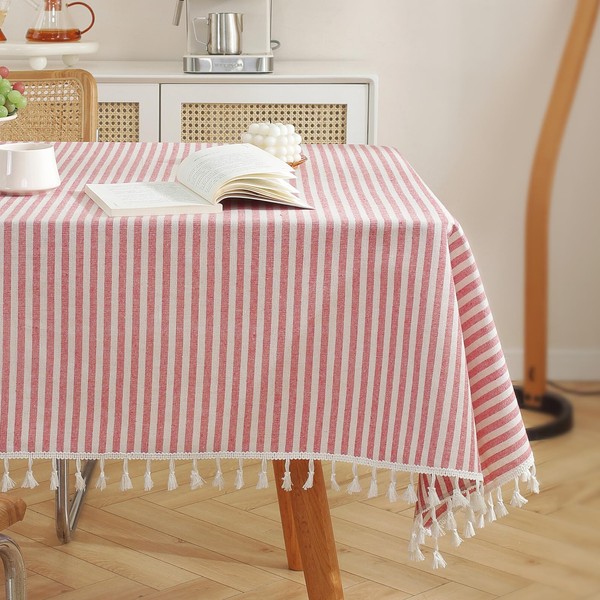 meioro Tablecloths Striped Tassel Table Cloth Rectangular Tablecloth Cotton Linen Table Cover Suitable for Home Kitchen Decoration (Red/White Stripes, 140×200cm)