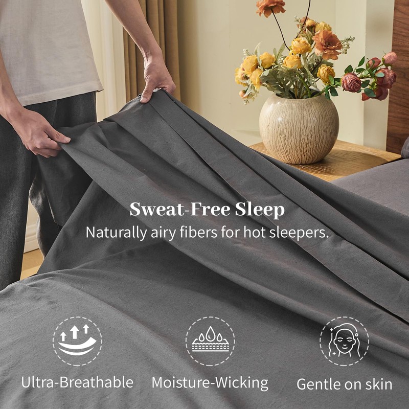 MEISHANG 100% Linen Sheets Queen Size - 4 Piece Breathable Sheet Set, Ultra-Soft Durable Flax Linen, Naturally Cooling & Moisture Wicking with 16" Deep Pocket (Dark Grey)