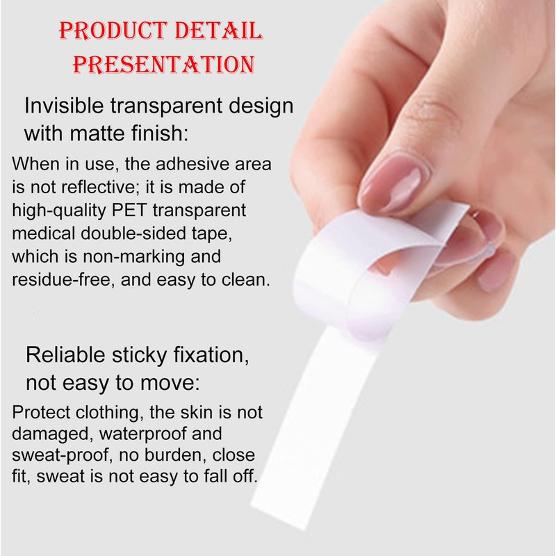 🌟 Made of high-quality PET transparent medical double-sided adhesive, gentle and non-irritating to the skin. The transparent fashion tape for all skin shades, and will not hide the natural colour of your skin, leaving no residue on your clothes or skin.