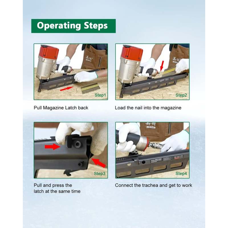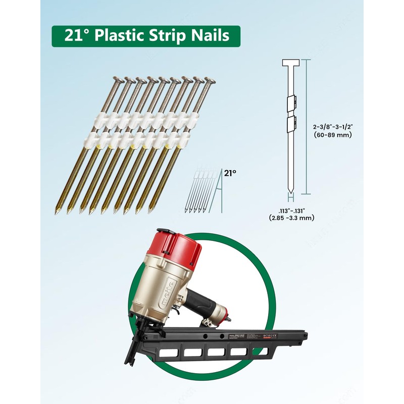 - [Special Angled Design] Our framing nails boast a plastic strip full round head and 21 degree angle, allowing for ease of use in tight spaces. Compatible with meite SN2183F (ASIN B0BB77G8LP) and other 20-22 degrees framing nailer guns.