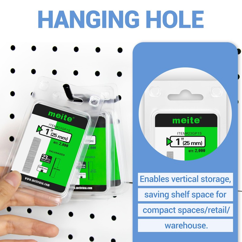 - [What's in the Box] Contains 2,000 counts 25 mm length galvanized 23 gauge pin nails in a plastic package to reduce the possibility of it falling apart in transit. Hanging hole enables vertical storage, saving floor/shelf space for compact spaces/retail/warehouse