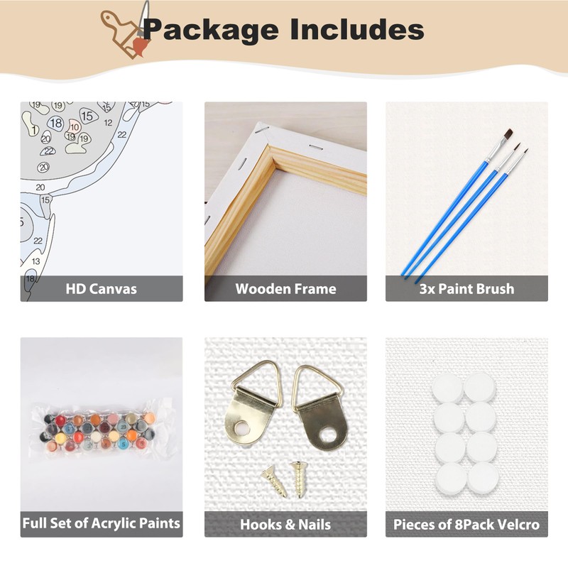 Paint by numbers Tools: Paint by numbers kits include a canvas with a frame which is already stretched, 3 painting brushes, 1 set of acrylic pigment colors, a sample picture, 8 Velcro and 2 hooks.