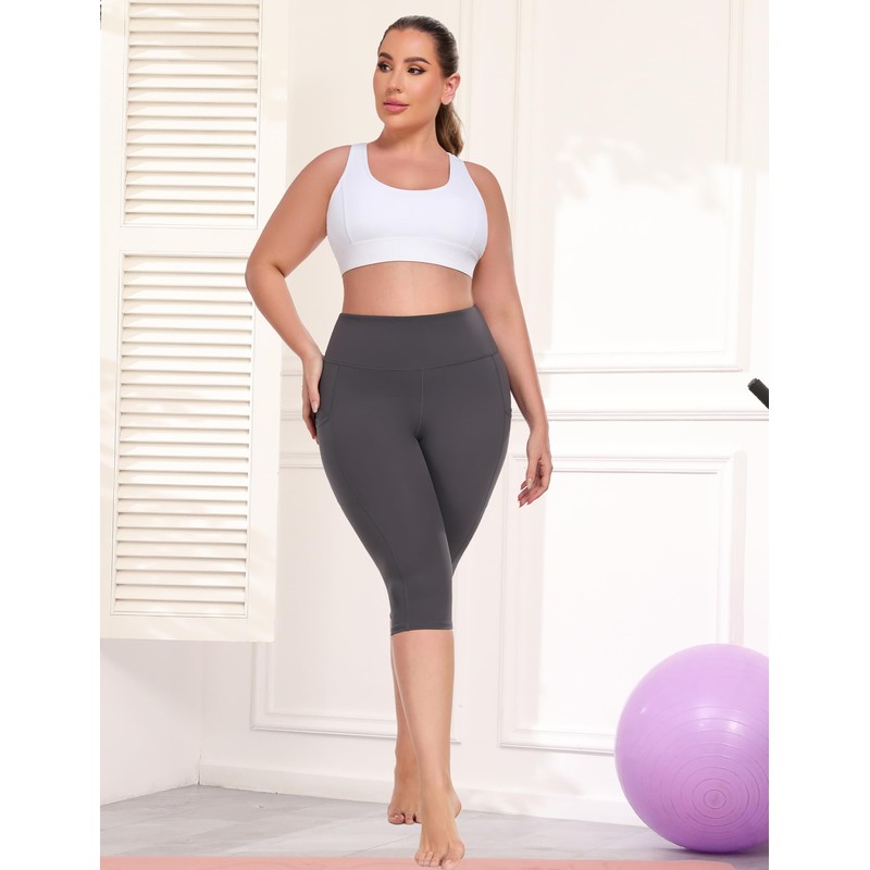 MEJING Plus Size Capri Yoga Pants for Women, Knee Length Leggings with Pockets, Grey Workout Legging Tummy Control, High Waist Activewear L