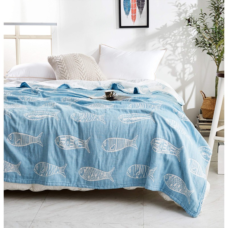 MEJU MEJU Fish Blue Modern Muslin Lightweight Summer Blanket for Bed Sofa Couch 100% Combed Cotton 3 Layer Soft Warm Bedspread Throw Blanket Bed Coverlet Sheet Full Queen 80 in X 90 in