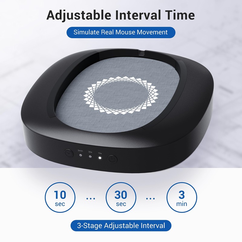 - ADJUSTABLE TIME INTERVAL: This mouse jiggler has a power button and a timer button. The timer button allows you to choose intervals of 10s, 30s, or 3min. Simply press the power button, set a suitable interval, and the indicator light in the middle will work simultaneously