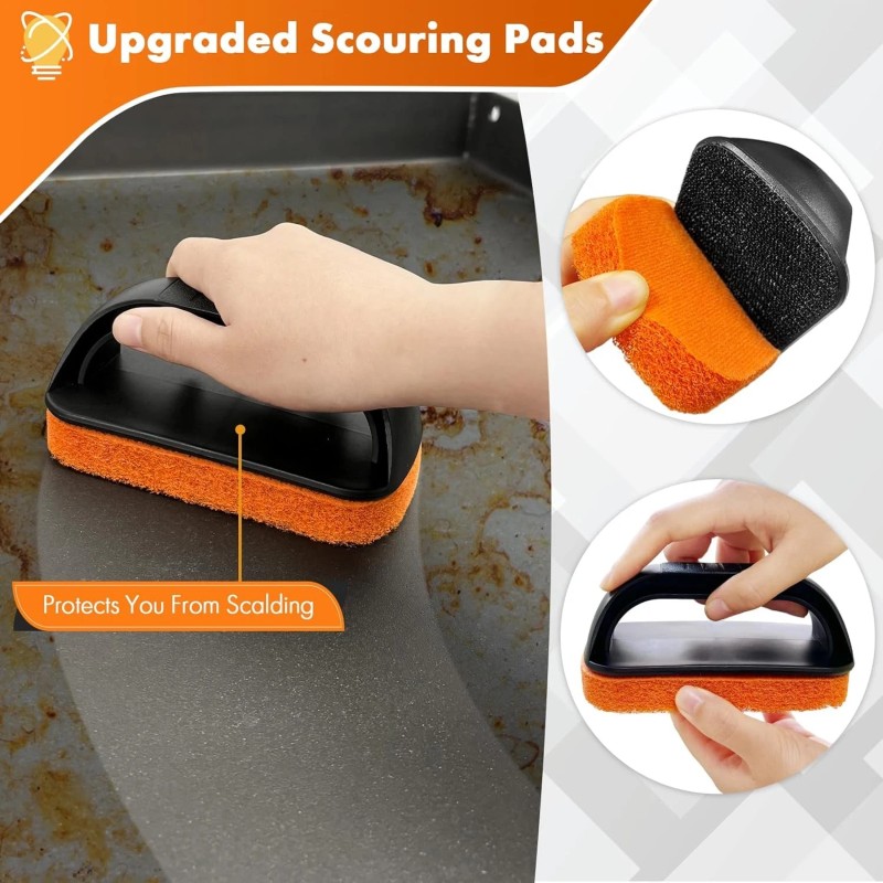 - SAFE - Protect from Scalding: The scouring pads with handle of the flat top grill cleaning kit are easy to install and remove, making them convenient for use on HOT or COLD surfaces. The handle allows you to clean without worrying about scalding.