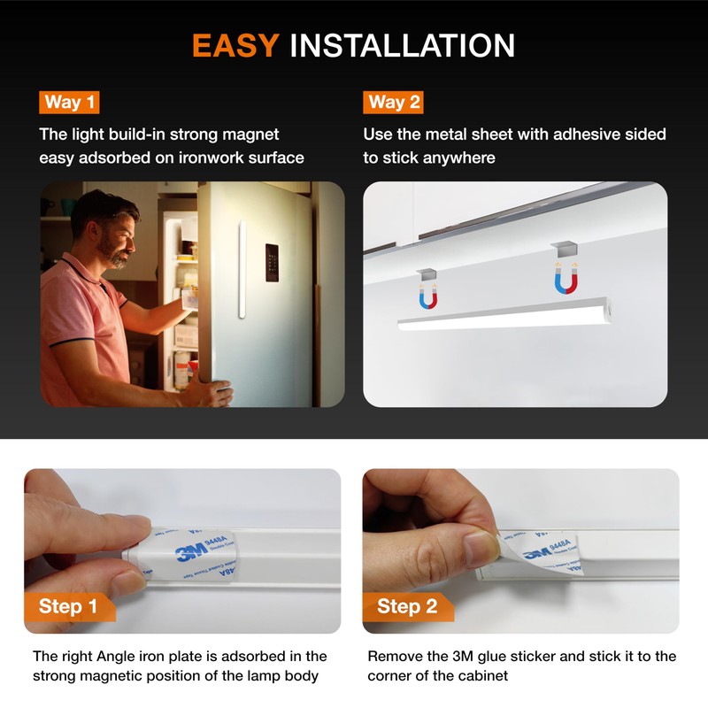 • 👍【Easy to Install, Wide Application】kitchen lights under cabinet has built-in magnetism and can be easily stuck on any iron surface, no electrician required. It also comes with a 3M adhesive right-angle metal plate, ensuring it sticks to any non-ferrous surface. Magnetic design allows LED strips to be easily removed for charging or changing positions, perfect for kitchens, bedrooms, picture, camping,closets, nurseries, counters, garages, basements, stairs, hallways, gift display cases, bedside