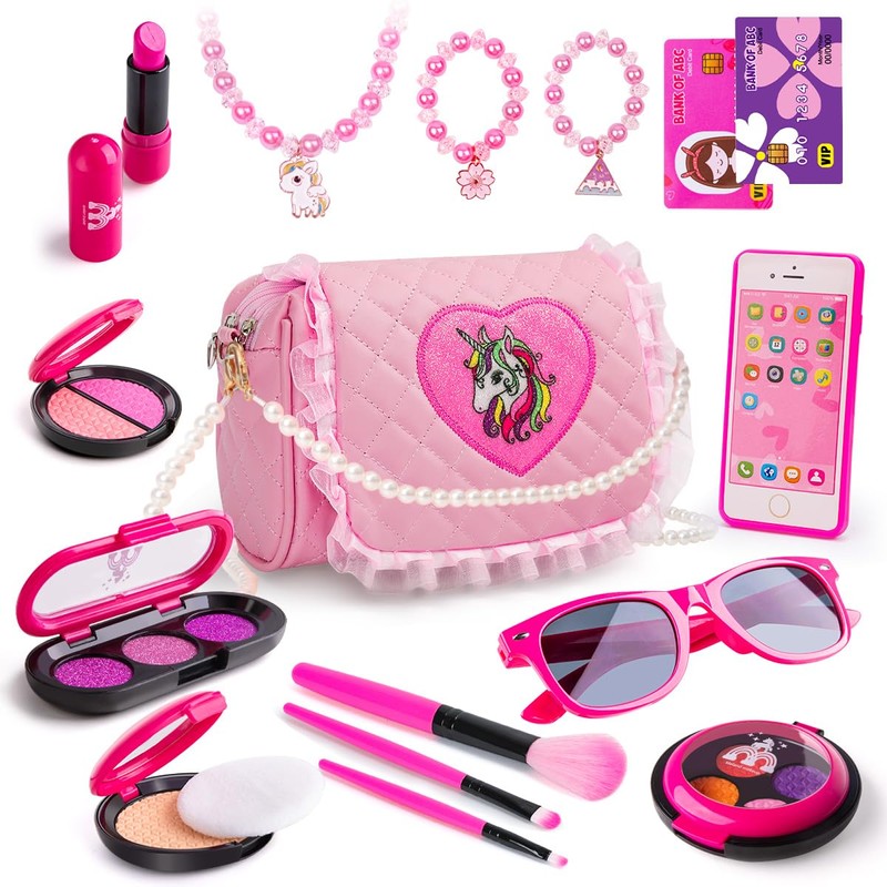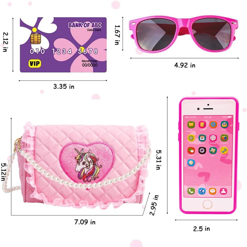 - A Hit for Your Little Princess Gifts Addition. Any dissatisfaction please free to contact with us. With a super realistic and cute design featuring a play cell phone, sunglasses, kids purse, credit card, and a bunch of fun makeup accessories, this set is sure to be a must-have and become their new favorite toy in home's nursery, kid's bedroom or playroom. Designed for use by children ages 3 4 5 6 7 8 9 10+.