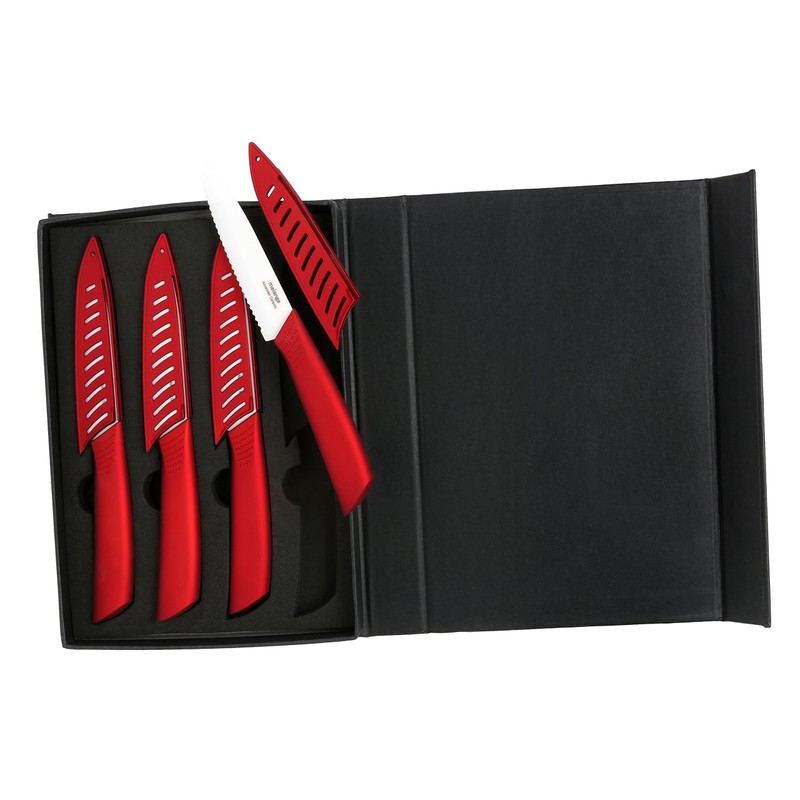 Melange 8-Piece Ceramic Steak Knife Set with Metallic Red Handle and White Blade