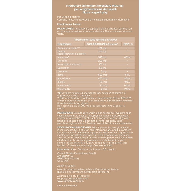 - SUPPORT OF HAIR COLOUR. Melaniq is a supplement for hair pigmentation, designed to support a body’s ability to produce melanin, the natural pigment that gives hair its colour. It contains copper, the essential mineral for the synthesis of melanin.