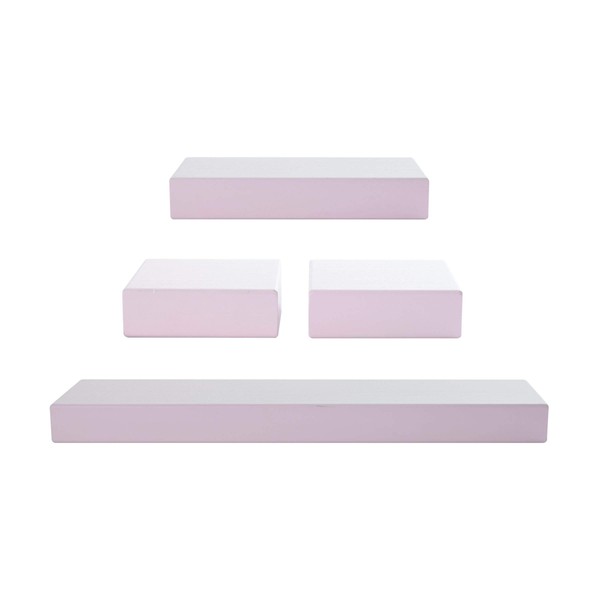 Melannco Chunky Shelves make a strong style statement in any room they're hung. This Set of 4 Pink Shelves are perfect for adding whimsy to your living room, family room, or bedroom. Included are one 24-inch shelf, which holds up to 5 pounds, one 12-inch shelf, which holds up to 3 pounds, and two 6-inch shelves, which hold up to 2 pounds. Use to display books, vases, knickknacks, or pieces of art. Made of wood. Oblong hardware, level, template, instruction sheet, new screws, and anchors included. Shelves measure: 12 x 6 x 4 inches and 24 x 6 x 4 inches.