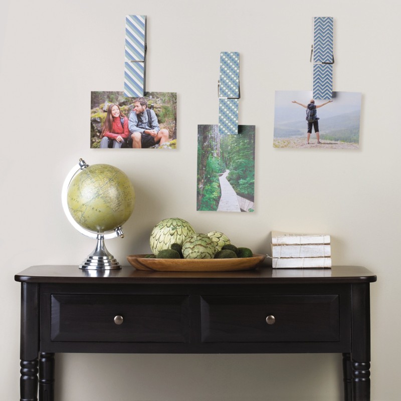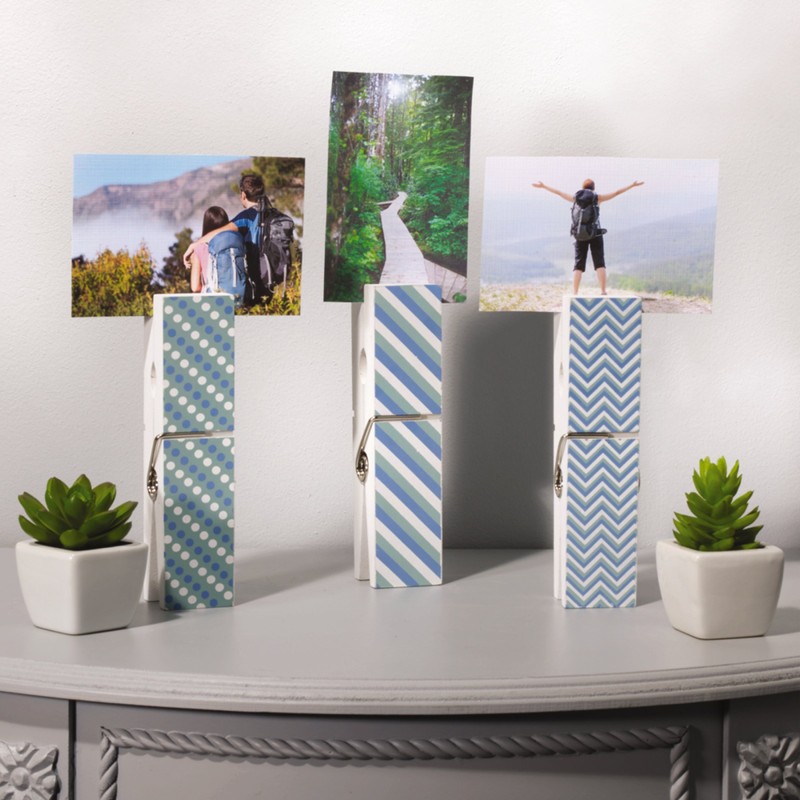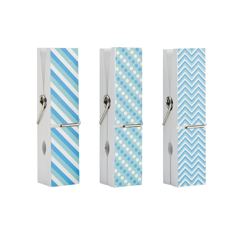 This Melannco set of 3 blue and white oversize clothespins is a fun, eye- catching solution for organizing papers or hanging photos. Sit them on a desk and they act as a paperweight; simply clip them around papers to clean up the clutter and keep things in place. OR hang them on a wall as clips to hold your favorite photos up for display, to show off your child's artwork, or to keep that grocery list or "to do" list in sight as a visual reminder. Clothespins are made of wood and each has a unique design: stripe, polka dot, and zigzag. Set of 3, each measuring 1-1/8 x 1-1/4 x 5-3/4 inches.