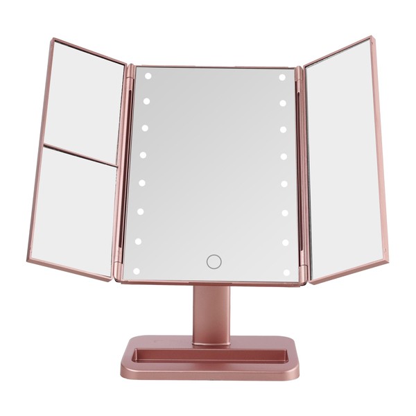 MELANNCO Rose Gold Tri Fold LED Vanity Mirror, 3 Magnifications and Dimmable LED Lights, Lighted Makeup Mirror, Touch Control