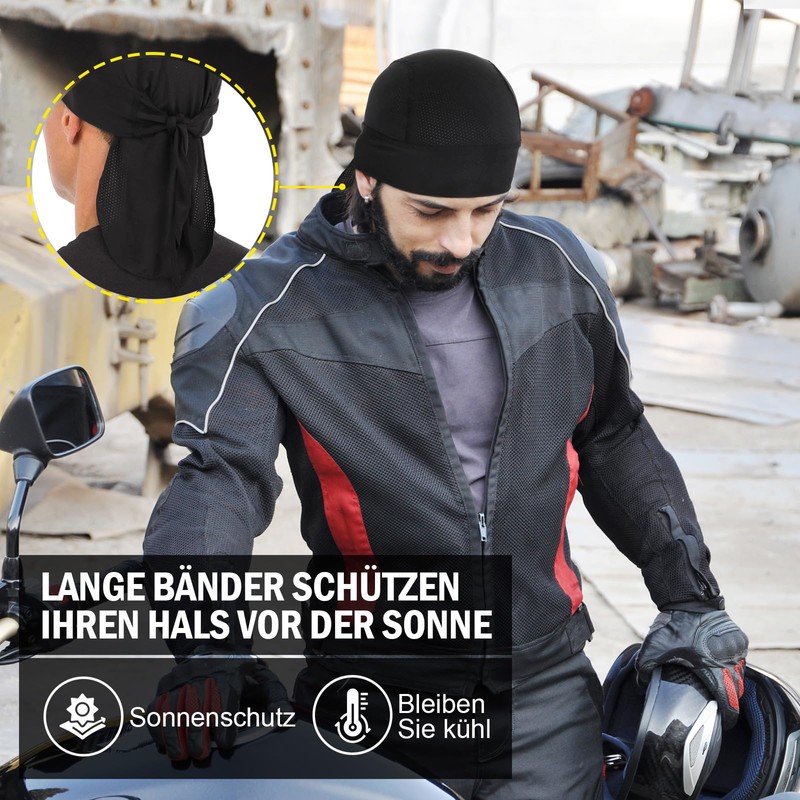 If you like to be active outdoors, e.g. when cycling, and frequently training in hot temperatures, you will sweat The double fabric brim effectively wicks away sweat, keeps it away from eyes and face, and ensures that your head stays dry. It is the perfect choice for use as a bandana cap with any type of helmet. The drawstring on the back ensures a firm fit that fits snugly around the head and does not slip off easily. It also has a neck protection for additional sun protection. These cloths are so lightweight, foldable and easy to carry that you can use them anytime and anywhere. And with the pack of 2, you always have a replacement at hand! This amazing men's headscarf is absolutely perfect for outdoor travel. It not only protects from the sun, but can also be used in many different environments.