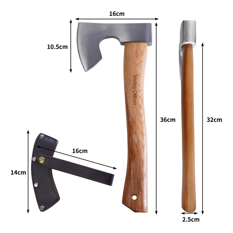 - Dimensions: total length cm, blade length: cm, weight: g. Comes with a protective axe head in a precision stitched leather sheath that not only ensures safe storage and protects the blade, but also minimises the risk of injury.