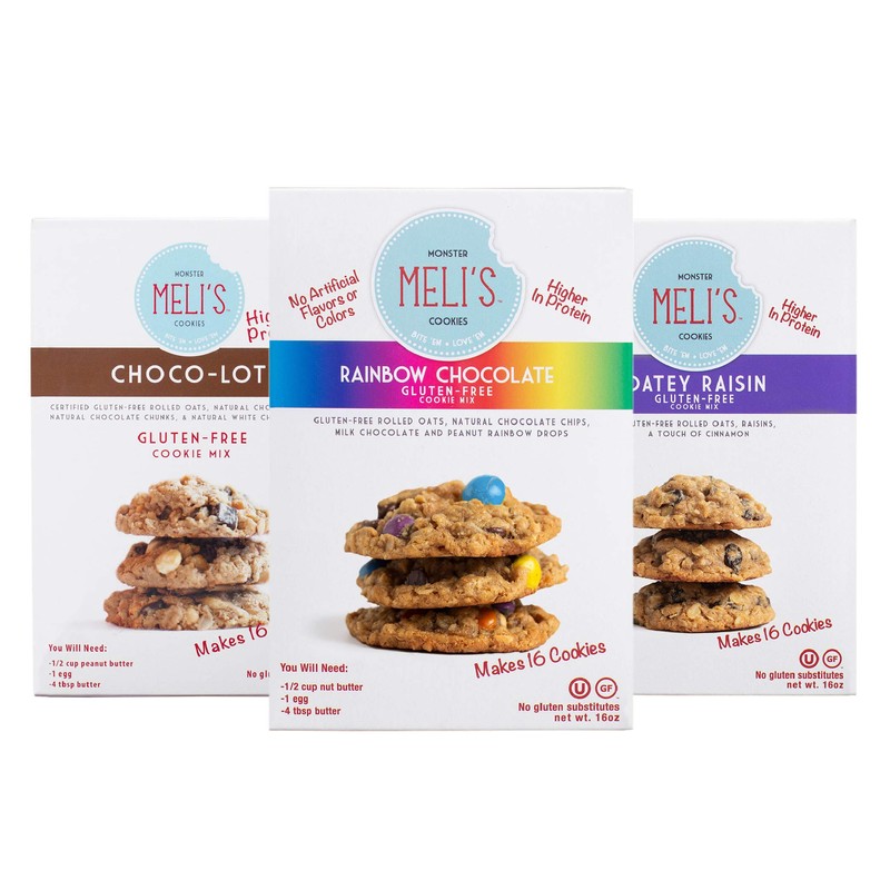 Three variety Meli's Monster Cookies mix is always naturally Gluten-Free and High in Protein, high in Fiber, and Preservative-Free. Made with certified gluten-free oats, all natural chocolate chips, M and M candies, and peanut butter M and Ms, Meli's Monster Cookies are easy to bake and taste amazing.