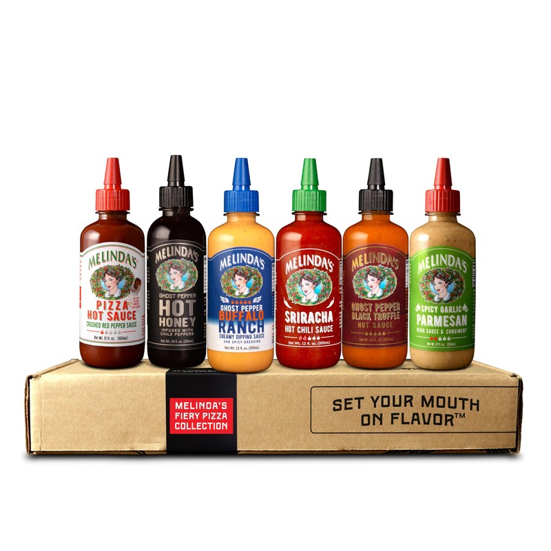 - EXPERIENCE PIZZA PERFECTION: Melinda’s Fiery Pizza Collection contains 6 craft pepper sauces and condiments perfect to dip or drizzle on your next slice of pie! This extra spicy pizza sauce set will have your new favorite sauce with intense heat. This hot sauce variety pack includes some of our most versatile sauces that strike the perfect balance between heat & flavor. Turn every slice into a fiery feast with Melinda's - because the best pizzas are the ones that sizzle!